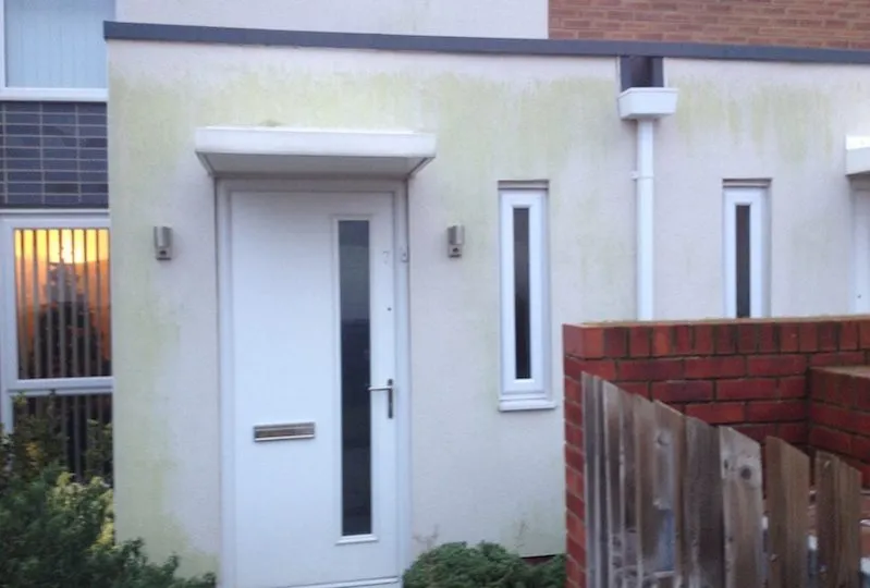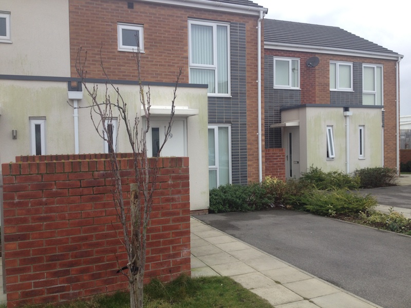 These are pictures from a recent render cleaning in the Liverpool project. A small housing association asked us to take a lot at some self-coloured render going green with algae growth.